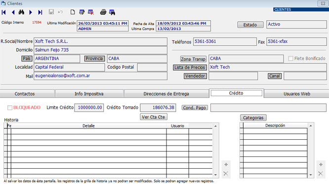 • Listas de precio, cada cliente puede tener una lista asignada. Las listas pueden ser un % de descuento para un rubro de productos que se aplica al precio base de producto, o puede configurarse un precio fijo para los productos en una lista determinada. Estas 2 opciones de configuración pueden combinarse dentro de una misma lista.